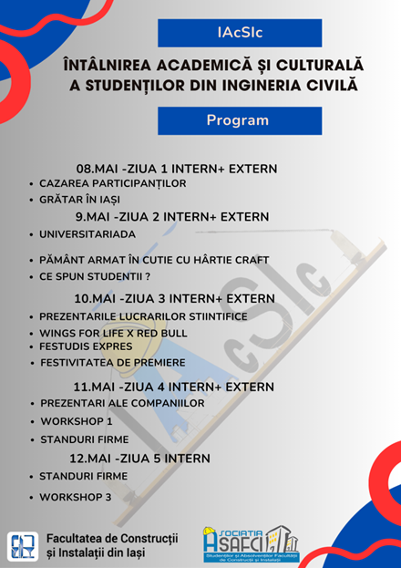 ASFACI anunță ”Întâlnirea Academică și Culturală a Studenților din Inginerie Civilă”, IAcSIc 2024, ediția a 11-a, în perioada 17-21 aprilie 2024. IAcSIc.Programul evenimentului este următorul: