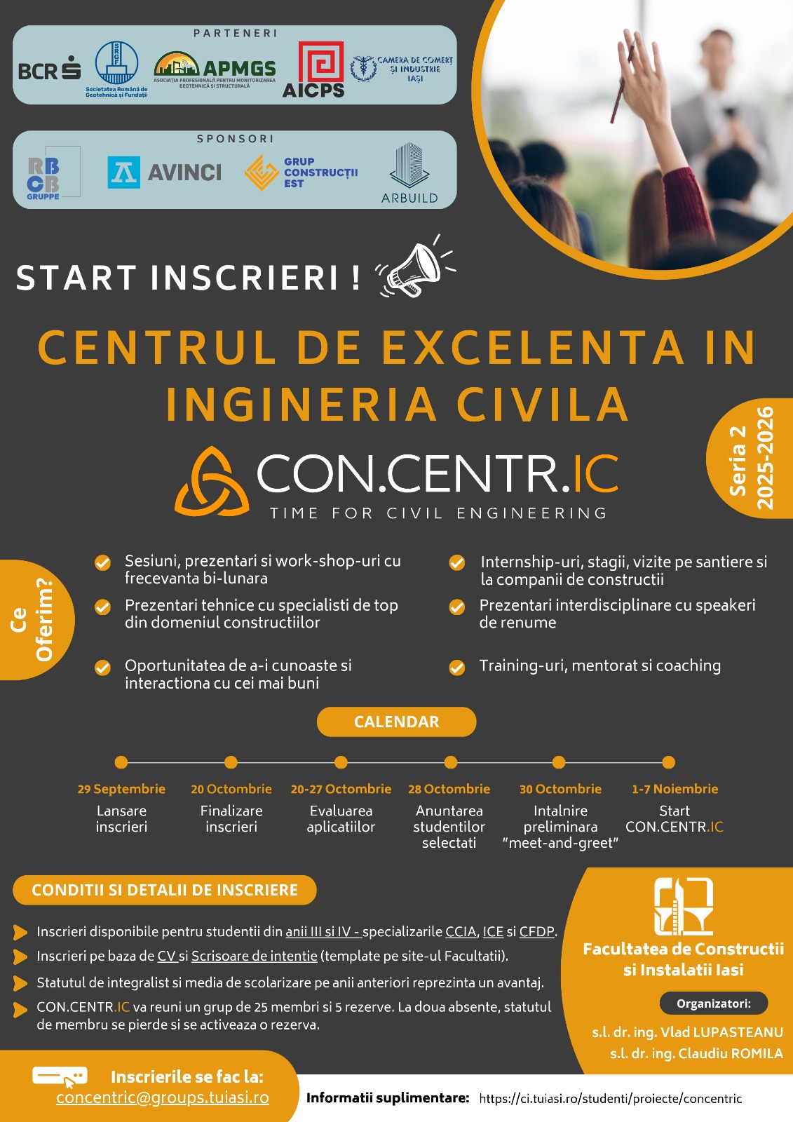 Centrul de excelență în ingineria civilă, CON.CENTR.IC, se adresează studenților de la specializările CCIA, CFDP și ICE, din anii de studiu III și IV.