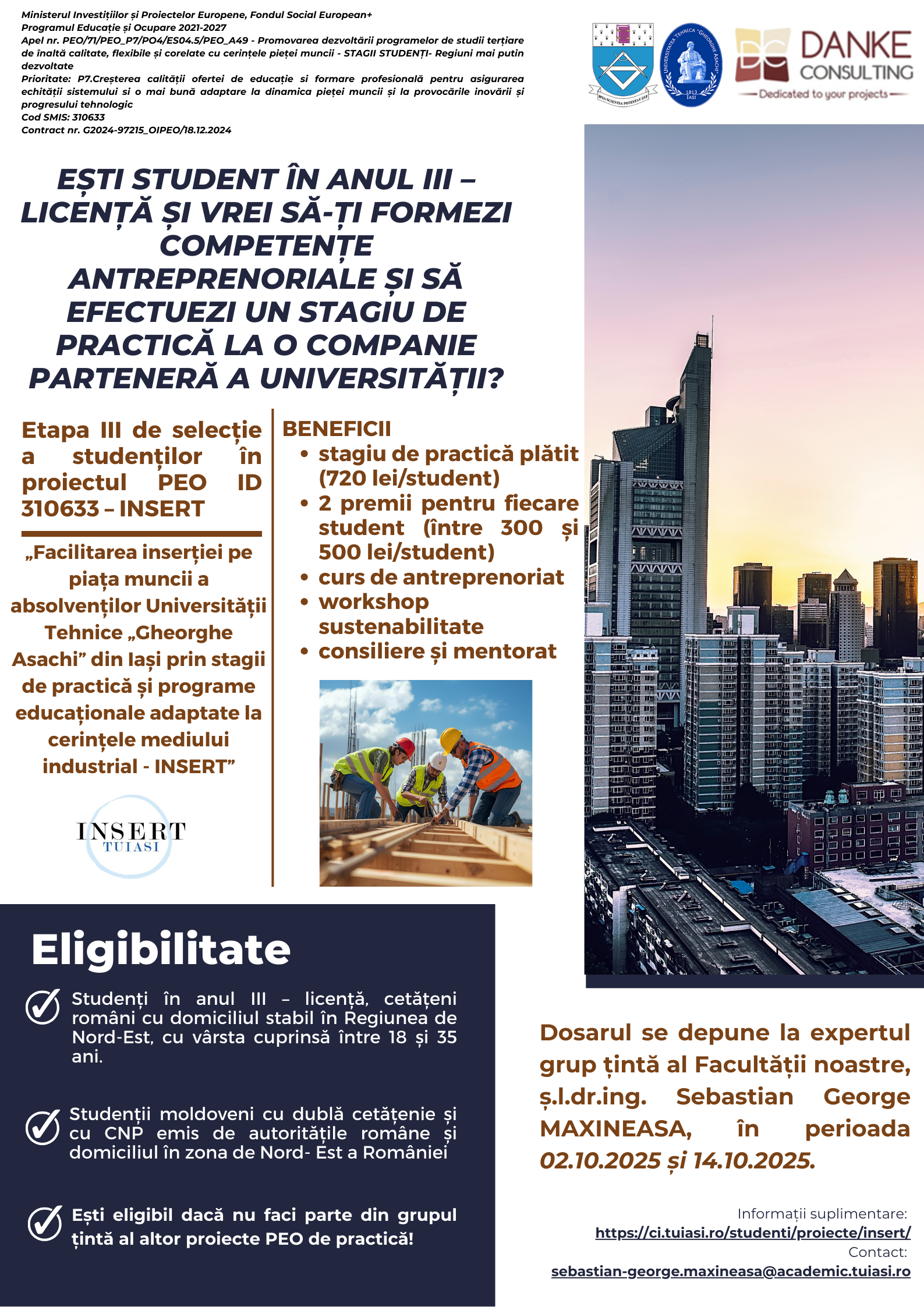 În cadrul Universității noastre se desfășoară proiectul INSERT, prin care se facilitează inserția pe piața muncii a absolvenților TUIASI prin stagii de practică și programe adaptate la cerințele mediului industrial.